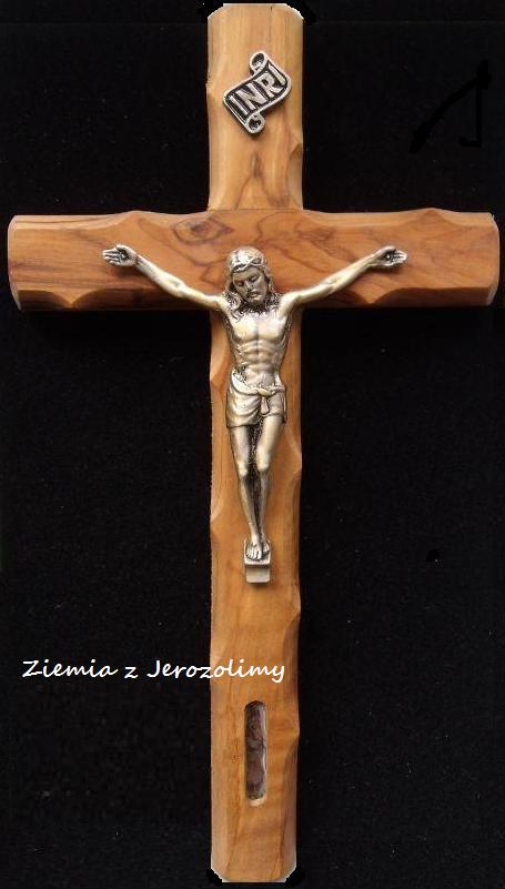 Krzyż cierniowy z krucyfiksem z ziemią z Jerozolimy. Wykonany z drzewa oliwnego