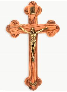 Krucyfiks w kształcie liścia koniczyny z Ziemi Świętej wykonany z drzewa oliwnego 14cm*8cm.Posiada świadectwo pochodzenia i eleganckie opakowanie.