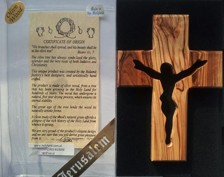 Krzyż grawerowany z Ziemi Świętej wykonany z drzewa oliwnego 15.5 cm*11.5 cm. Posiada świadectwo pochodzenia i eleganckie opakowanie.