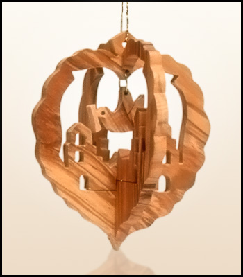 Wiszące świąteczne ozdoby z Ziemi Świętej wykonane z drzewa oliwnego.