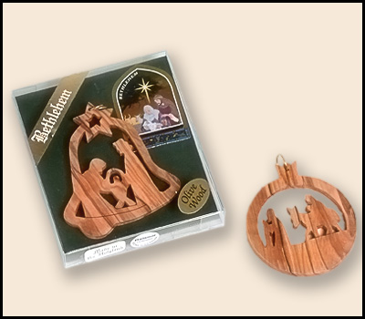 Zestaw składający się z 2 wiszących ozdób świątecznych z Ziemi Świętej wykonanych z drzewa oliwnego 8.5cm*10cm. Posiada świadectwo pochodzenia i eleganckie opakowanie.