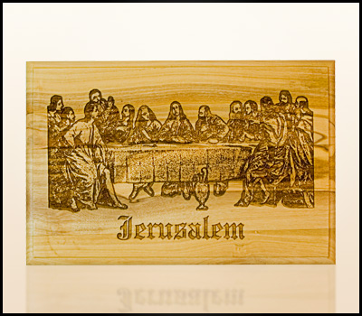 „Ostatnia Wieczerza”, płytka ścienna grawerowana laserem z Ziemi Świętej wykonana z drzewa oliwnego 10cm*7cm. Posiada świadectwo pochodzenia i eleganckie opakowanie.