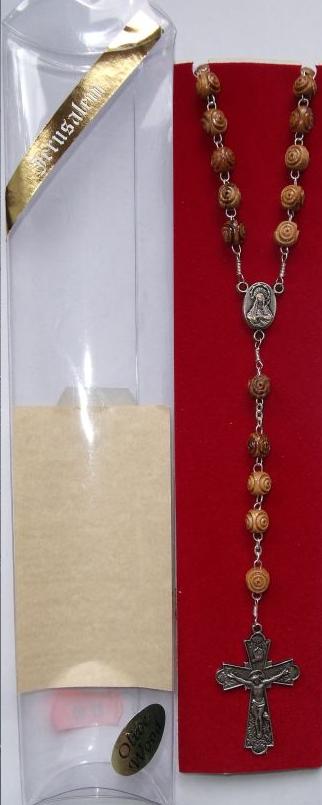Różaniec o kulistych grawerowanych paciorkach z Ziemi Świętej jest wykonany ręcznie z drzewa oliwnego. Wszystkie metalowe elementy są posrebrzane. Posiada świadectwo pochodzenia i eleganckie opakowanie.